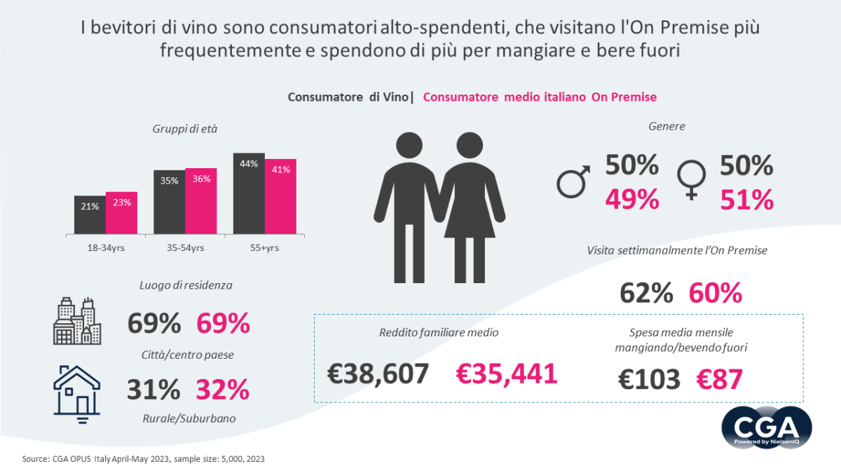 Il 60% degli amanti del “nettare degli dei” afferma che uscire per mangiare e bere fuori casa rimane una priorità fondamentale. Inoltre, il 71% frequenta locali con una continuità uguale o maggiore rispetto a 3 mesi fa, spendendo la stessa cifra, o addirittura superiore. In Italia il consumatore di vino è alto-spendente - con un reddito medio familiare superiore ai 38mila euro -, paga mensilmente una cifra di circa 103€ per mangiare e bere fuori casa e si colloca prevalentemente nella fascia d’età degli over 55 (44%). Il 62% frequenta settimanalmente i locali e vive generalmente in grandi aree urbane (69%).