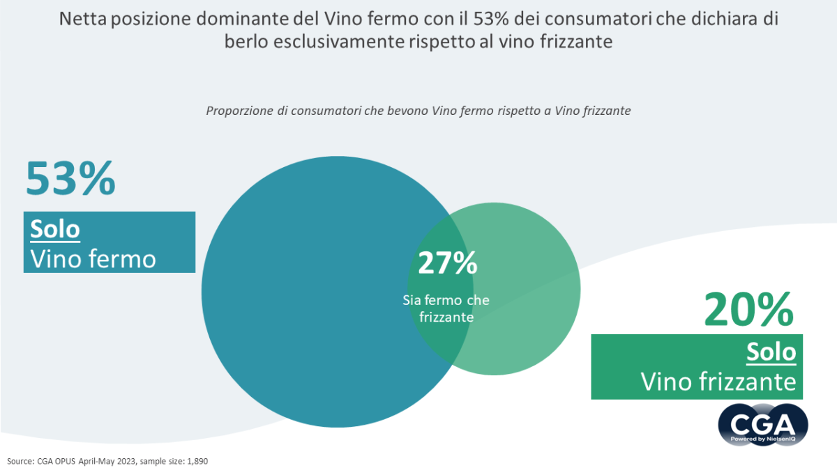 Nel Belpaese il vino fermo traina la categoria: lo scelgono infatti 3 consumatori su 4 (75%). Vino frizzante (44%) e vino da dessert (28%) si posizionano al secondo e terzo posto. Inoltre, il vino fermo se paragonato al vino frizzante detiene una posizione dominante con il 53% dei consumatori che dichiara di berlo esclusivamente rispetto alle bollicine.