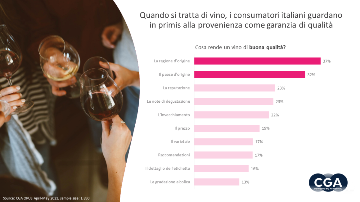 CGA by NielsenIQ segnala che prima di scegliere un calice di vino, gli italiani controllano in primis la provenienza, elemento di garanzia per la qualità del prodotto selezionato; infatti la regione (37%) e il Paese d’origine (32%) si collocano al primo e al secondo posto, seguiti subito dopo dalla reputazione (23%).