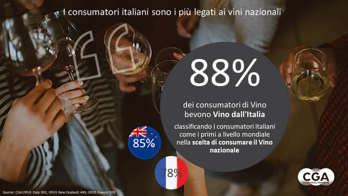 Dall’analisi emerge anche che gli italiani (88%) sono i primi consumatori a livello mondiale a prediligere vini del proprio Paese, seguiti da Nuova Zelanda (85%) e Francia (78%). Inoltre, tra i cultori del vino, più di un terzo (37%) indica la qualità del prodotto come caratteristica imprescindibile per la scelta del proprio drink (+ 7 pp rispetto al consumatore medio). Fattore meno rilevante per definire un vino di qualità è il prezzo, che si posiziona solamente al sesto posto (19%) e non influisce in maniera consistente.