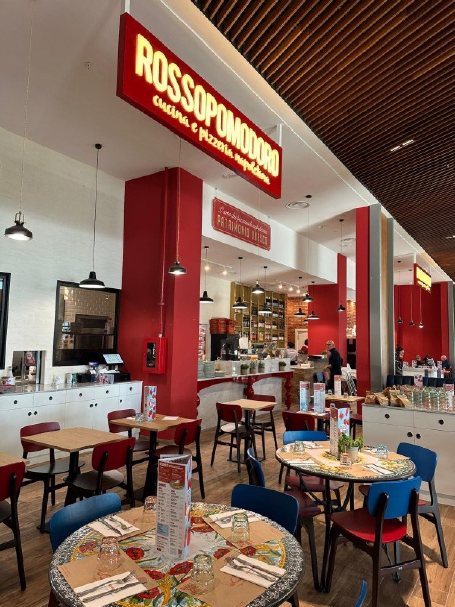 Per quanto riguarda Rossopomodoro invece, Augusto Contract ha optato per uno stile rustico con pareti in mattoni rossi a vista che riscaldano l’atmosfera del punto vendita.