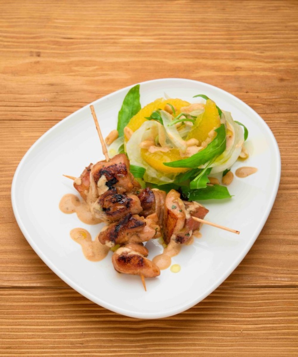 Sulla brace o in griglia arrostire gli spiedini dopo averli composti con la carne di pollo marinata. Disporre sul piatto gli spiedini, accompagnarli con l’insalatina di finocchi e arance e dressare il tutto con la salsa satay.