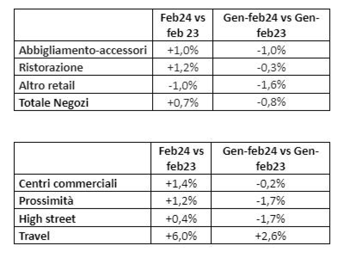Anche nei canali di vendita si registra un leggero positivo con variazioni mensili di minima entità per centri commerciali a +1,4%, negozi di prossimità +1,2% e high street +0,4%. In questo contesto spicca la performance positiva del travel che, con il confronto mensile al +6,0% e il totale anno al +2,6%, risulta il comparto più dinamico di questo inizio 2024.