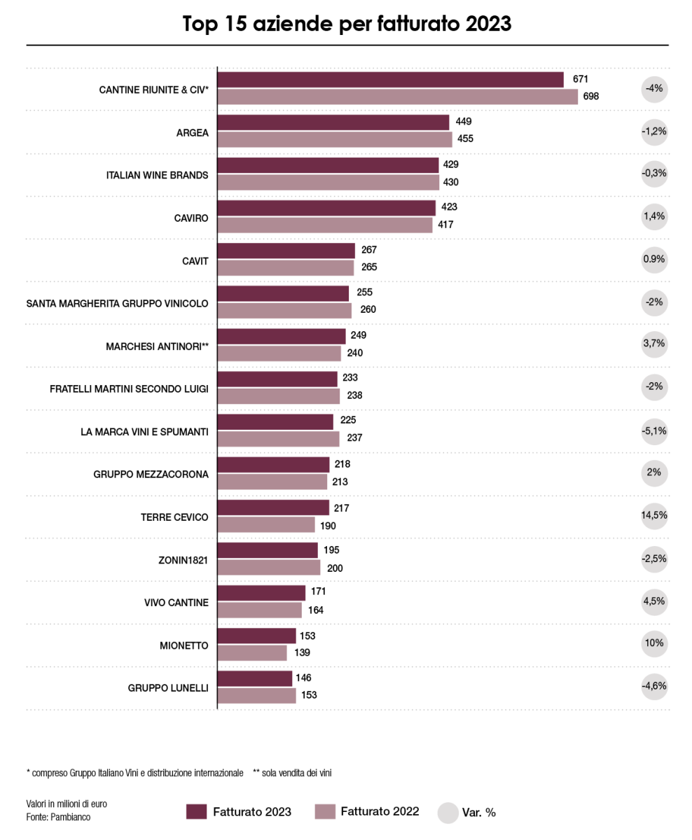Cantine Riunite & Civ mantiene la posizione di leadership con 671 milioni di euro ma con un calo del -4% rispetto all'anno precedente. Argea e Italian Wine Brands invece, rispettivamente con 449,4 milioni di euro e 429,1 milioni di euro, hanno confermato la loro solidità nonostante le difficoltà del contesto economico. A completare il quartetto dei quattrocentomilionari è il Gruppo Caviro, in quarta piazza con 423 milioni di euro e una crescita del 1,4% trainata principalmente dall'export.