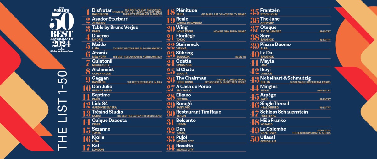 William Drew, direttore editoriale di The World’s 50 Best Restaurants, ha commentato: «E' con grande entusiasmo che annunciamo la classifica di The World's 50 Best Restaurants 2024, sponsorizzati da S.Pellegrino & Acqua Panna, e premiamo l’iconoclasta Disfrutar come The World’s Best Restaurant 2024. Il team, guidato da Oriol Castro, Eduard Xatruch e Mateu Casañas, ha dimostrato un’incredibile dedizione, deliziando ad arte i commensali con ogni piatto del suo ampio menu. Quest’anno il mondo dell’alta gastronomia celebra una classifica veramente globale che comprende i ristoranti di 26 paesi, dimostrando che il desiderio per la varietà e l'eccellenza nel settore dell’ospitalità non mostrano segni di cedimento».