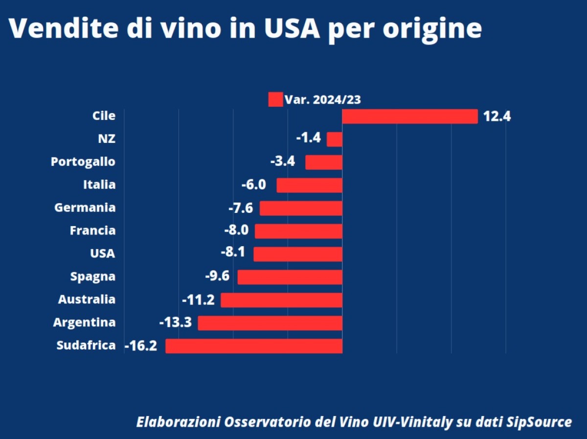 Contestualmente, anche l’ipotizzata fine del surplus di magazzino tra i distributori resta una chimera, visto che il rapporto tra stock di alcolici e vendite effettive viaggia ancora a livelli molto alti con un’eccedenza di circa 10 miliardi di dollari. Tutti i principali Paesi fornitori dunque assistono a un calo generalizzato ad eccezione del Cile (+12%) che invece ha puntato sui prezzi da saldo. L’Italia (-6%) fa meglio di Francia e Stati Uniti (-8%), di Australia e Spagna (-11% e -10%), ma non della Nuova Zelanda, scesa anch’essa in terreno negativo (-1%).