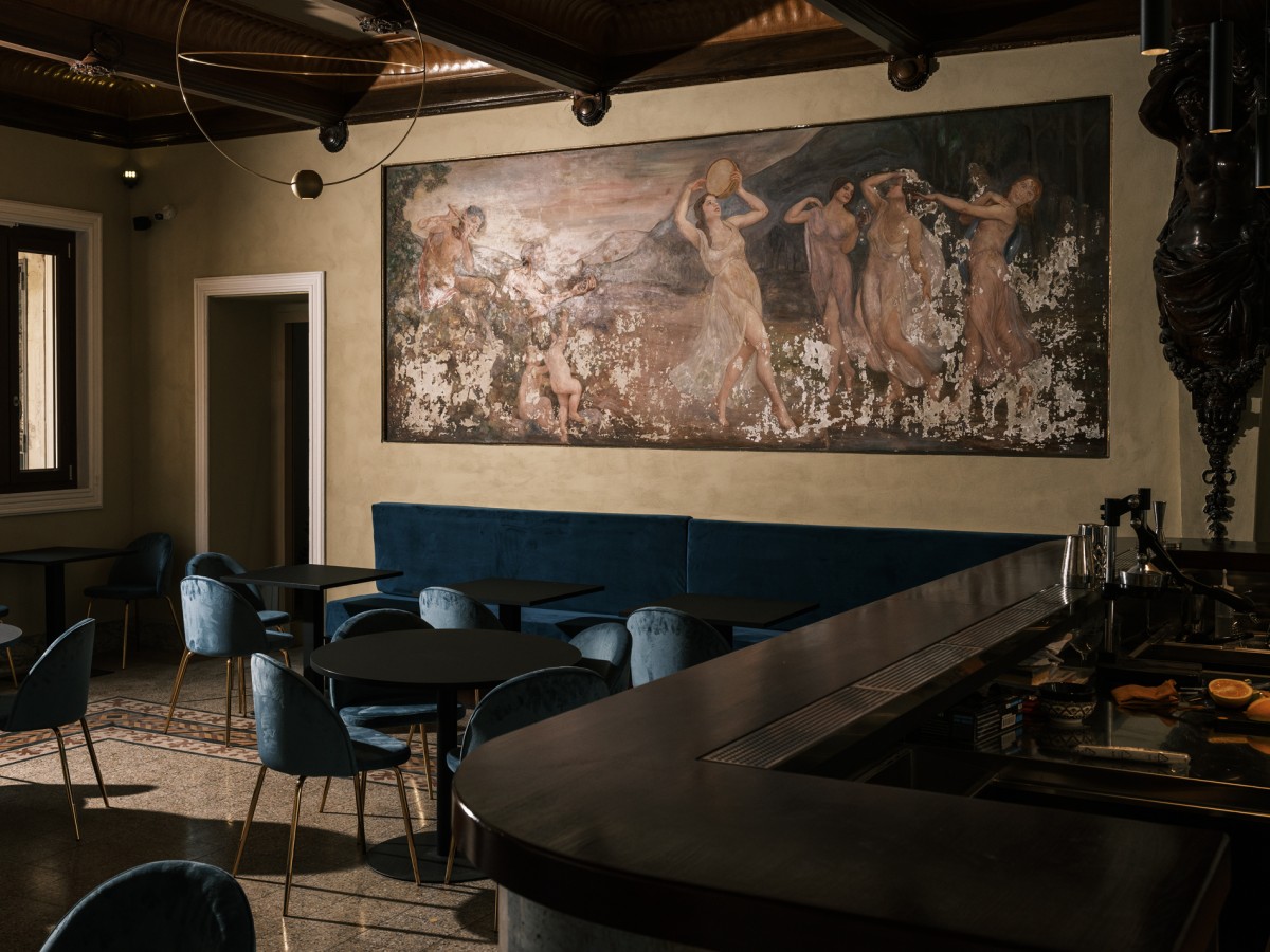 Il locale in cui i tre proprietari hanno deciso di sviluppare il loro format si trova in un palazzo in stile liberty, che ospitò il primo ristorante della città, ricco di affreschi e statue appartenenti alla mitologia classica. «Abbiamo scoperto che il nostro ristorante si trovava in un palazzo storico frequentato da artisti e intellettuali degli anni Venti - raccontano i proprietari-. Da lì è nata l’idea di abbracciare quell’atmosfera. Gli affreschi con Bacco e Diana, le statue di Ninfe, il soffitto a cassettoni e le cementine colorate, ritrovati durante la ristrutturazione, ci hanno ispirato a mantenere tutto nel loro stato originale. Volevamo creare un luogo che celebrasse il piacere della vita, del cibo e del bere, evocando eleganza, divertimento e libertà, proprio come negli anni ruggenti».