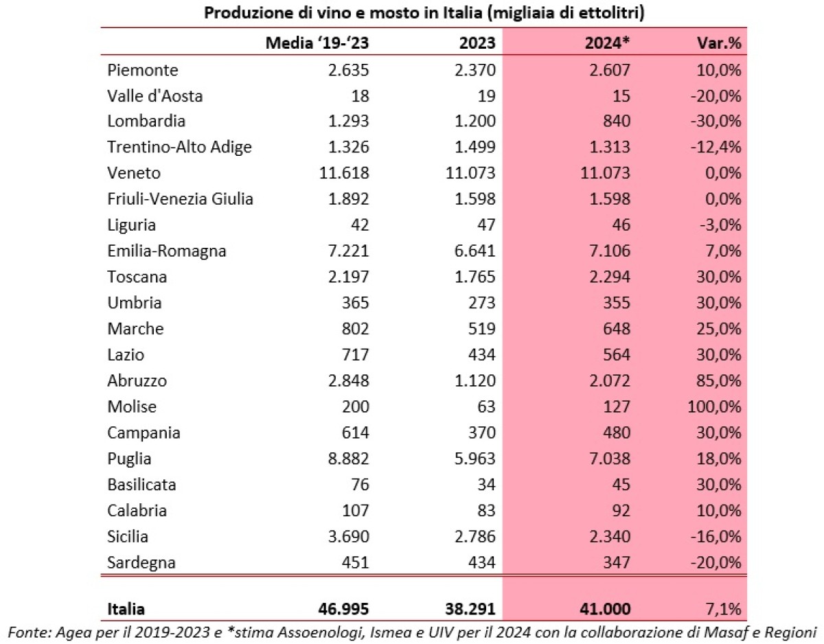 Più omogenea la situazione al Centro, caratterizzato da recuperi in doppia cifra rispetto alla scarsa produzione 2023, con Marche a +25% e Toscana, Umbria e Lazio a +30%. Al Sud, invece, si hanno incrementi significativi soprattutto in Abruzzo e Molise (rispettivamente +85% e +100% dopo il flagello della peronospora dello scorso anno), seguiti da Basilicata e Campania (entrambe a +30%), Puglia (+18%) e Calabria (+10%).