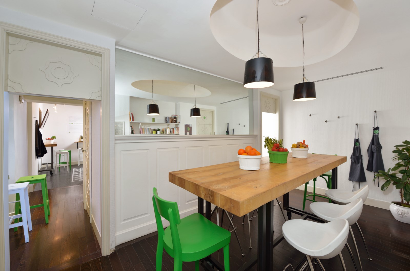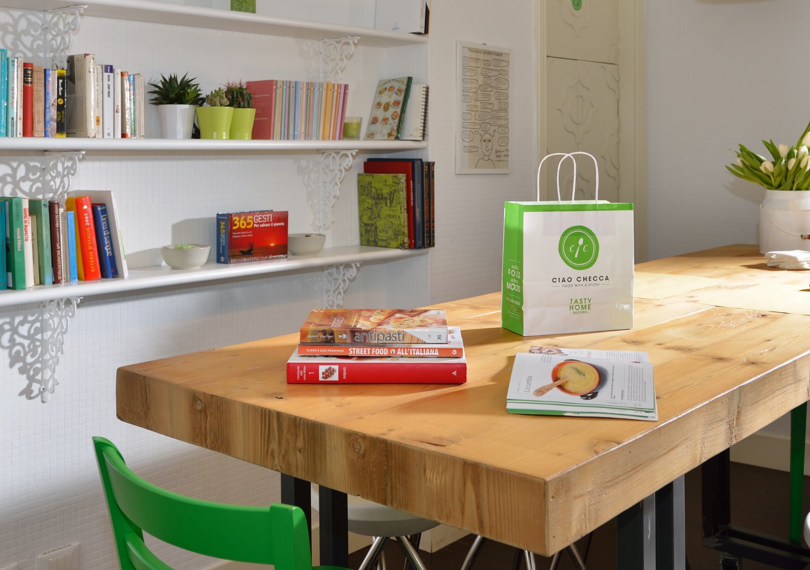 La cucina è a vista, sia dall’interno del locale che da Piazza di Firenze, e il design sofisticato, contemporaneo e curato, utilizza materiali e legni di recupero. La progettazione di CostaGroup, che ha brillantemente captato l’essenza del progetto, è dunque in assoluta sintonia con lo spirito di Ciao Checca; particolari ricercati, attenzione ai dettagli, trame bianco-verdi e nulla di superfluo. Bancone bianco all'ingresso e un ambiente accogliente e luminoso. Nella sala interna il tavolo sociale è circondato da piante e libri mentre, varcato l’ingresso, una bella vetrata divide la cucina con pavimento di parquet e mosaici dalla sala principale. E così, nella breve attesa, gli avventori possono osservare gli Chef all’opera. Le sedute, colorate e informali per chi sceglie di mangiare in loco, riflettono l’impostazione street-food del progetto. Se invece si ha voglia di gustare la Pasta alla Checca e le altre ricette di casa del menù passeggiando nel centro storico di Roma, il cibo viene servito in confezioni - comode, funzionali e, ça va sans dire, completamente compostabili - perfette per il “taste away”.