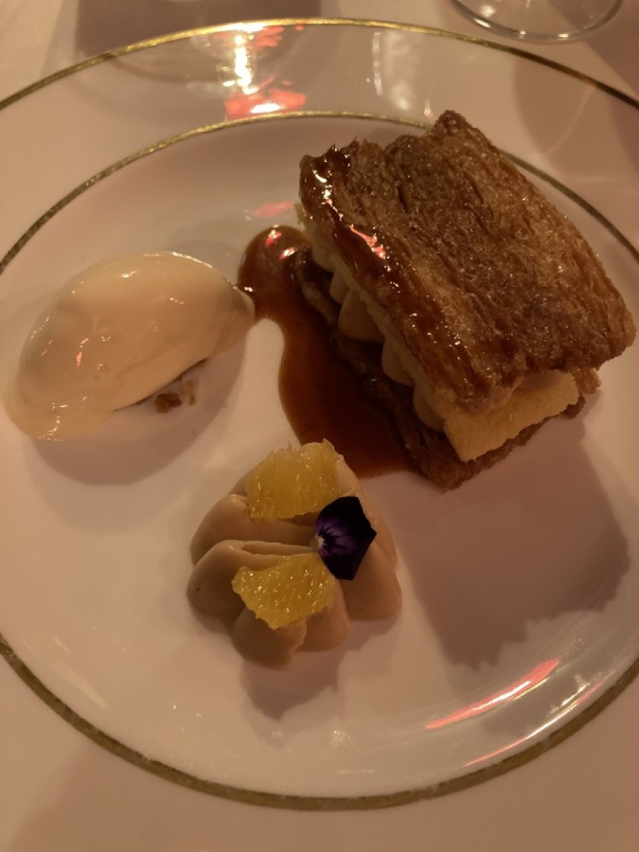 Si torna al caffè con il Pithivier di faraona, che è stato accompagnata dal Calima estratto in Cold Brew, servito in una boule, non solo per sprigionare gli aromi di questo raffinato caffè realizzato nella Finca El Paraiso con doppia fermentazione, ma anche per evocare comparazioni con il tradizionale accompagnamento tra cibo gourmet e vino. Sul finale il dolce, una Millefoglie con cremoso al caramello, composta di arancia e gelato al Cointreau, si è sposata con un’altra monorigine colombiana, Paraiso, dagli aromi di frutta dolce, mango e vaniglia, estratta a caldo in Chemex.