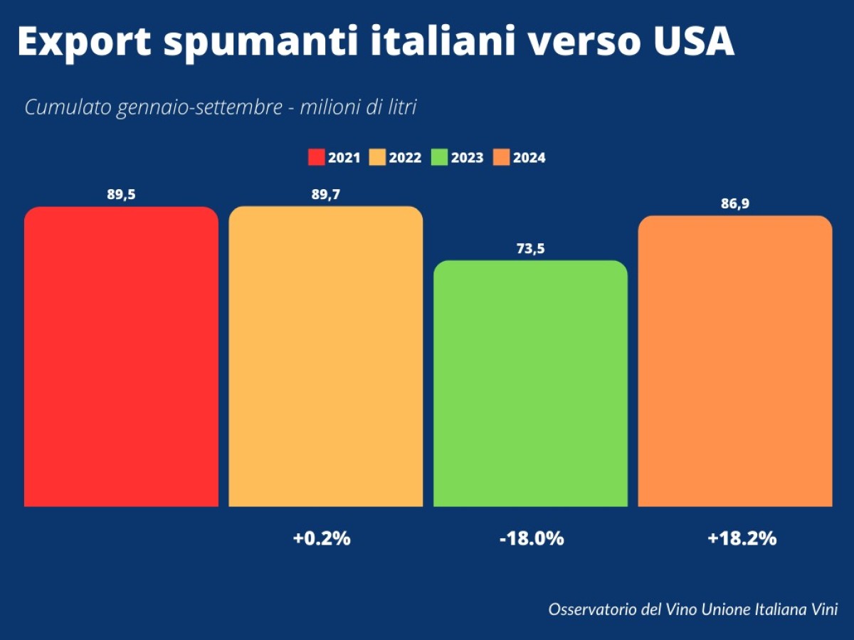Boccata d'ossigeno per lo spumante tricolore. A settembre l'export negli Stati Uniti ha registrato un balzo del +56% (nel pari periodo del 2023 il livello era sceso a -36%) e ciò riporta le spedizioni dello sparkling italiano, capitanato dal Prosecco, appena sotto i livelli del 2022 (-3% a volume) nel cumulato gennaio-settembre. A rilevarlo è l’Osservatorio del vino Uiv nell’analisi sui dati export dei primi nove mesi di quest’anno che, sul versante spumanti, registrano 86,9 milioni di litri spediti verso gli Stati Uniti, il 18% in più a volume rispetto ai 73,5 milioni del 2023, che nel periodo segnava un tendenziale a -18%.