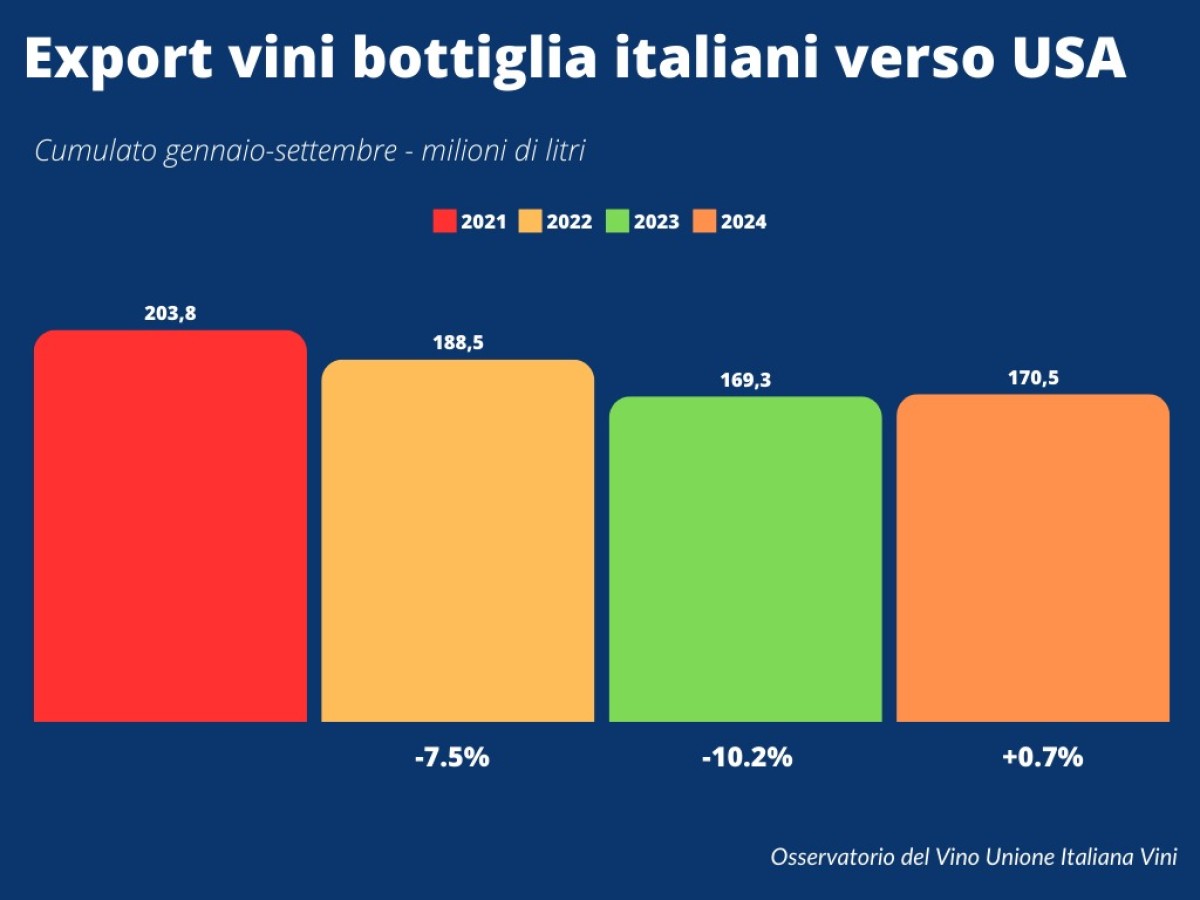 «Guardiamo con attenzione e cautela questi dati anche perché gli effettivi consumi di vino italiano negli Stati Uniti, che riscontriamo attraverso SipSource, evidenziano nei primi dieci mesi dell’anno un calo generale del 4,5%; un combinato disposto tra un +2,2% per gli spumanti, un -8,4% per i rossi e un -5,6% per i bianchi tricolori - ha detto Paolo Castelletti, segretario generale di Unione Italiana Vini –. In merito ai possibili dazi annunciati dal presidente Trump, per ora l’unica cosa certa è l’anticipo di mercato che si evidenzierà nei prossimi mesi».