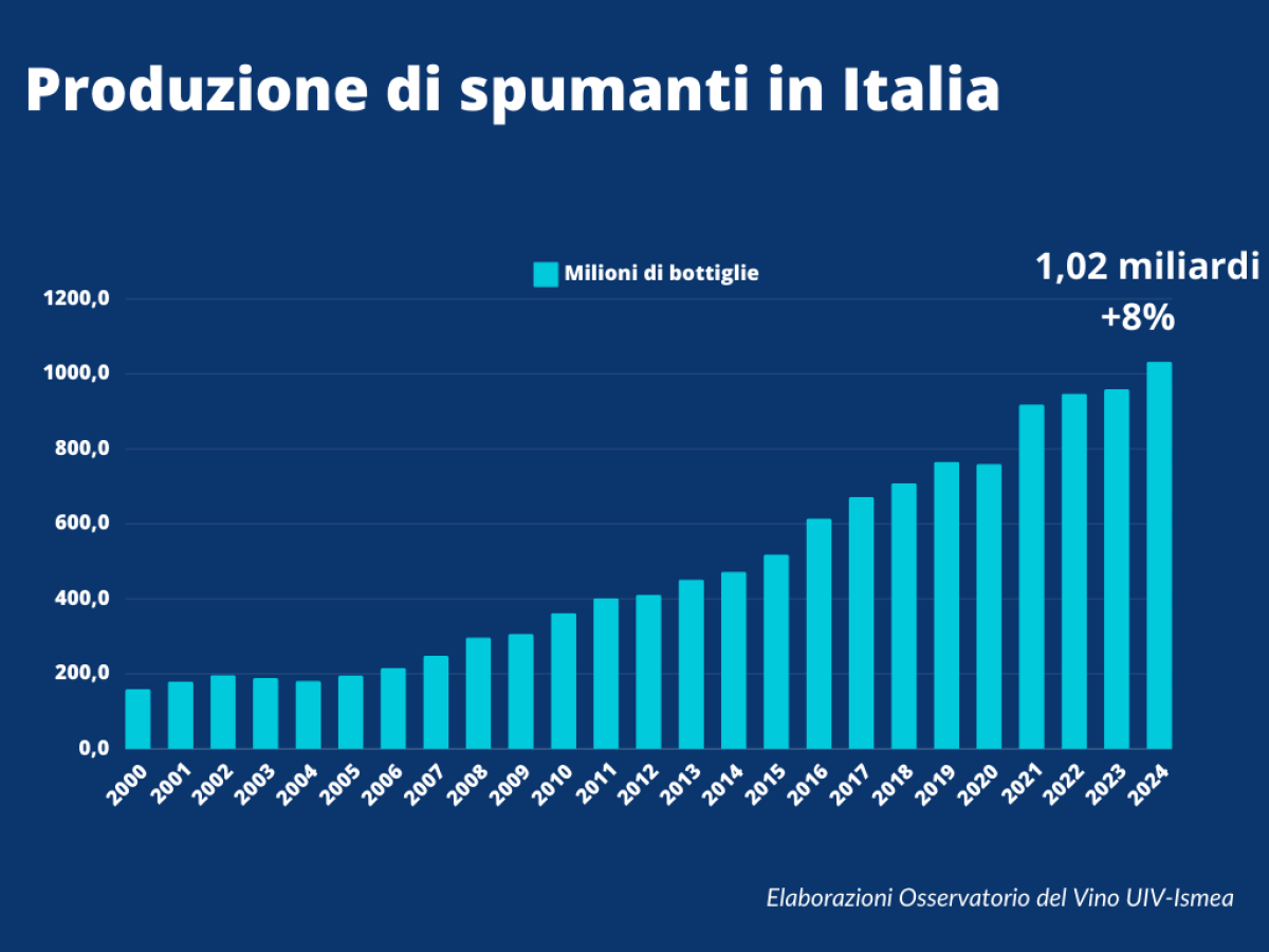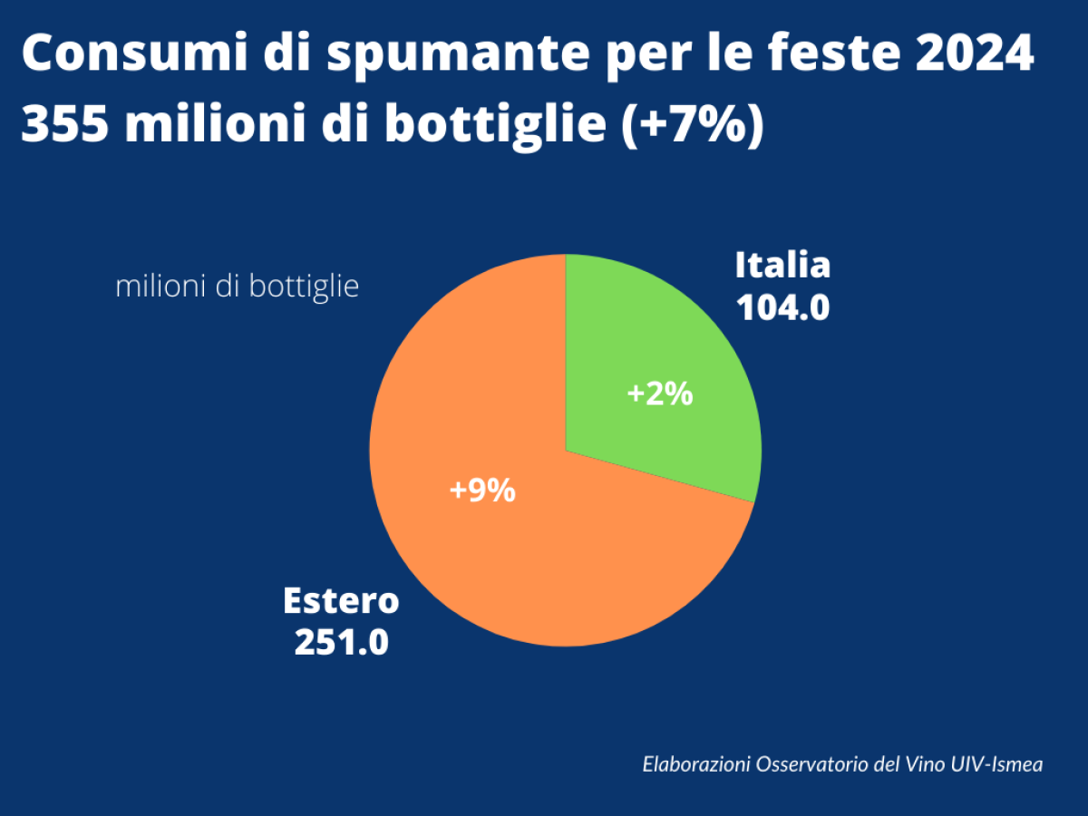 È record per le bollicine italiane. Come rilevato dall'Osservatorio del vino Uiv-Ismea nel report di fine anno, lo spumante si appresta a superare la quota di 1 miliardo di bottiglie prodotte e commercializzate nel 2024 e di queste, 355 milioni (+7%) saranno stappate tra Natale e Capodanno in Italia e nel mondo.