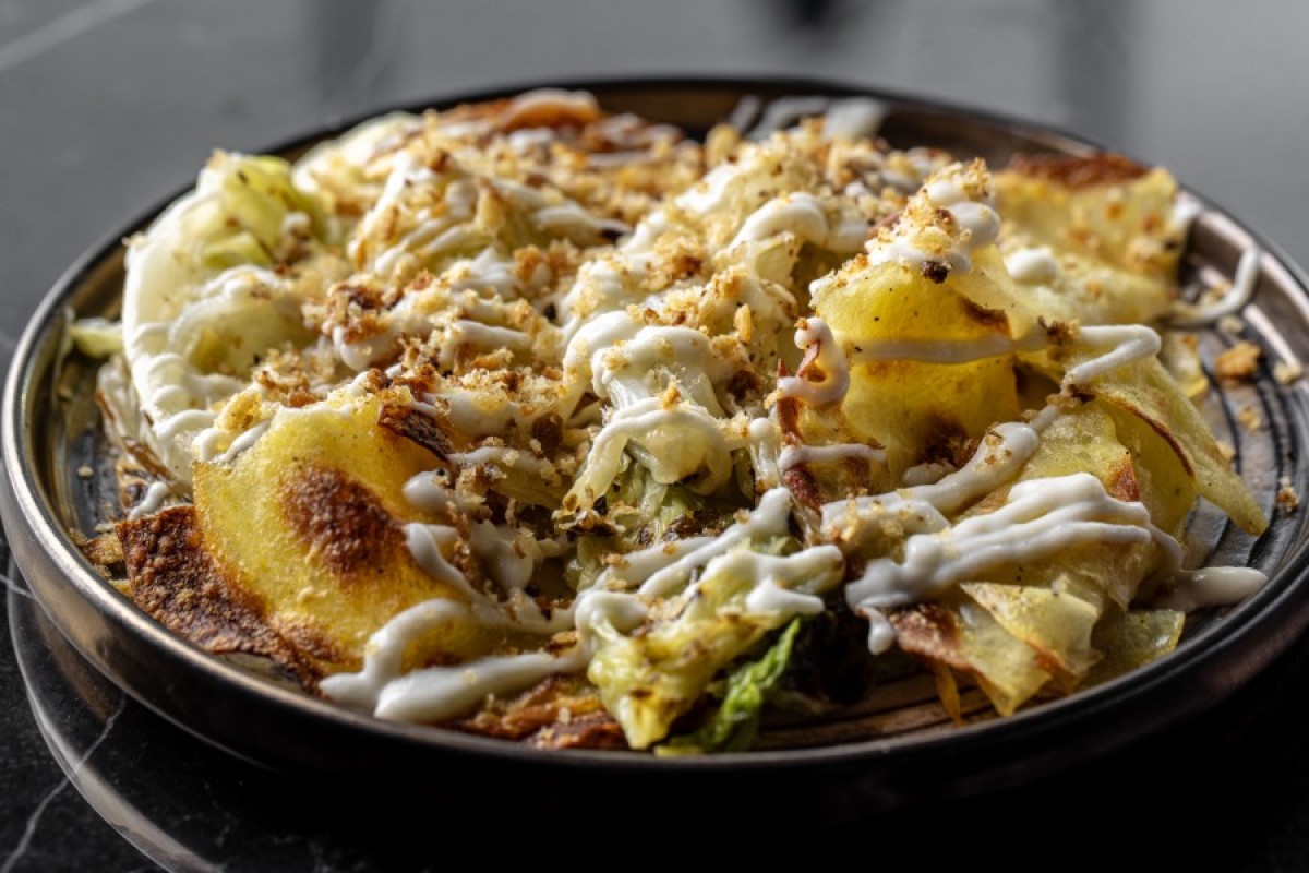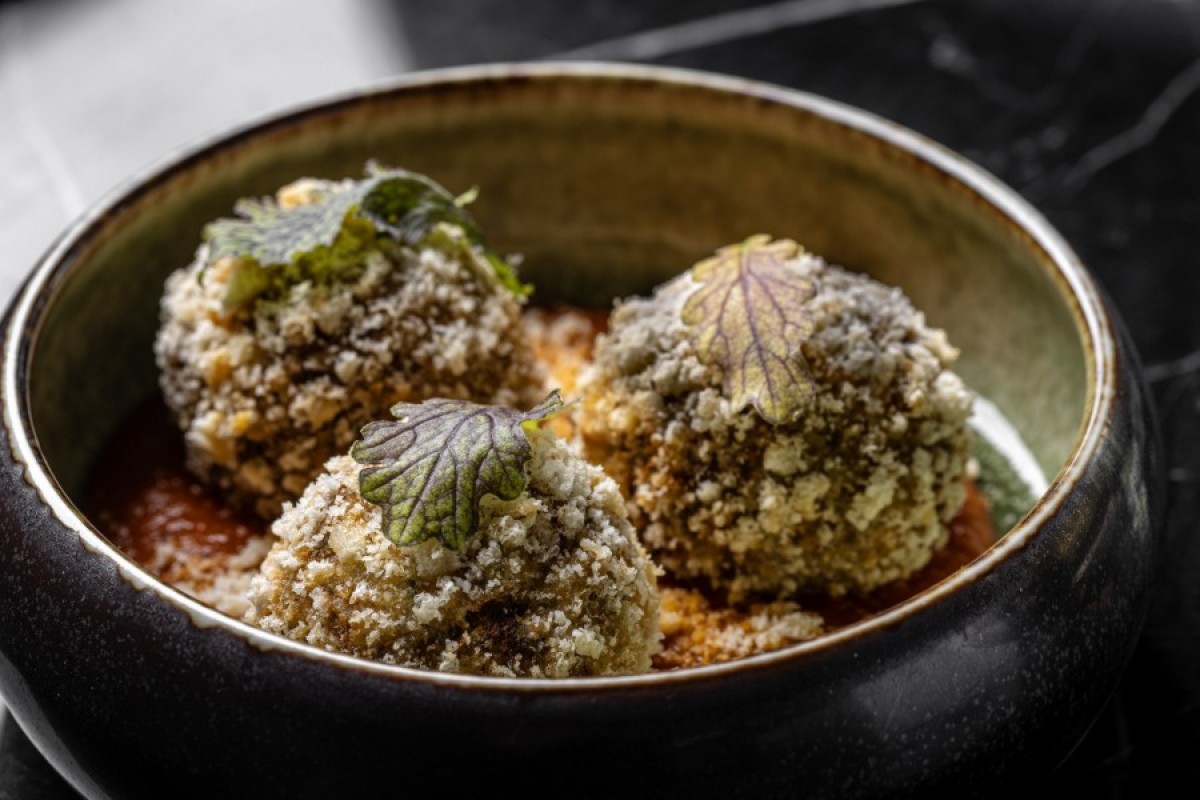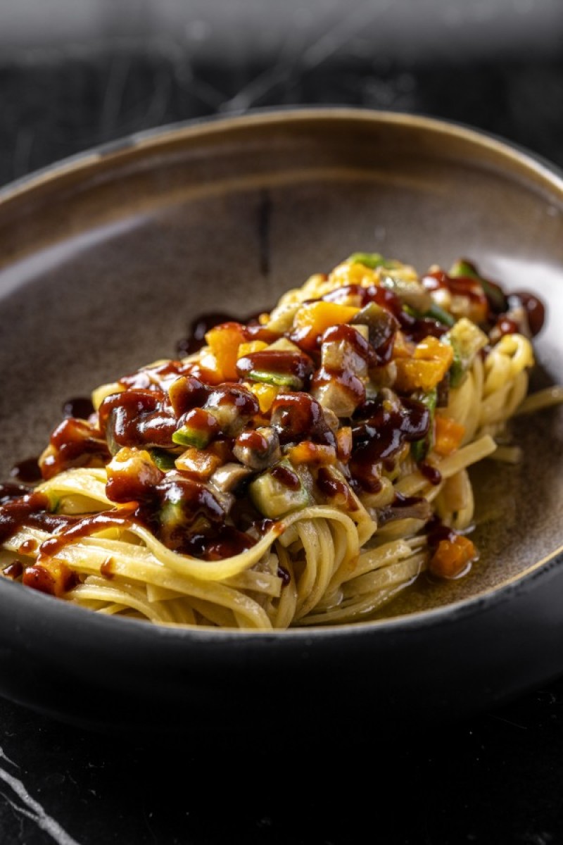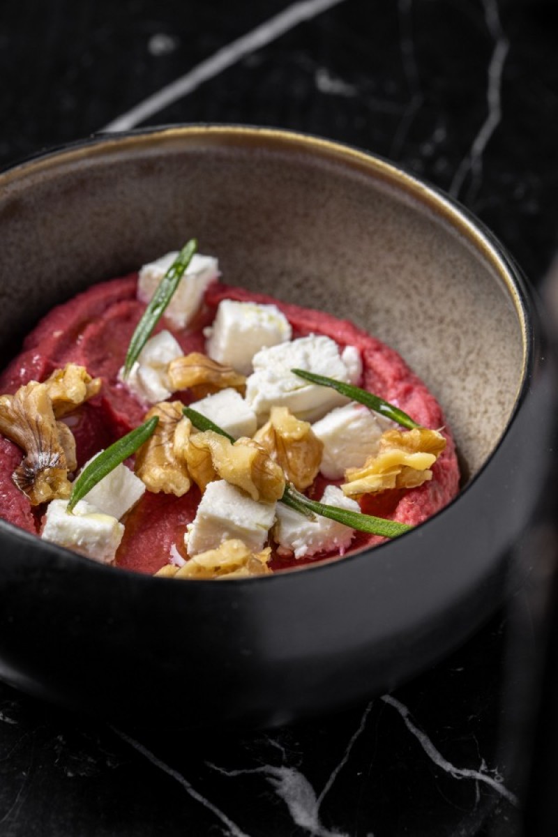 Tra i piatti del pranzo: Hummus di barbabietola con feta, noci e rosmarino; Bocconcini di baccalà con salsa tzatziky e aneto; Zucca alla scapece con misticanza di campo aromatica e mayo al pistacchio; Gnocchetto con broccolo, alici e pane aromatizzato; Vellutato di porro bruciato, patate e crostini di pane; Pollo al cutty con latte di cocco e verdure all’orientale; Stracotto di manzo con funghi ed il suo fondo. Tra i piatti della cena: Yuca con mayo chiplote; Porchetta CBT con emulsione di alici e mizuna corallo, Tagliolino aglio e olio con calamaro marinato e pane aromatizzato, Yakitori di carota e broccolo alla brace, laccati al miso e mayo al cipollotto; Ombrina con patata mantecata, fondo di manzo e funghi.