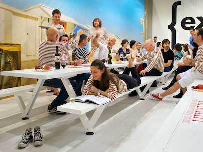 giardino, sala e ufficio. Da un contesto all’altro si trasforma con estrema duttilità da mobile da esterno corredato da panche, in tavolo da pranzo e da ufficio. Il tavolo modulare si allunga a seconda dell’ambiente e dello spazio. Interessante è anche il tavolo con ombrellone Abachus. L’idea è di ripensare il modello classico in una versione contemporanea per una consumazione veloce e informale. I manubri in gomma aiutano a stare in piedi come un appoggio. La versione di Gargantua si presenta invece nella versione più classica con seduta a panca. Elementi che possono essere inseriti in spazi aperti per enoteche paninoteche e bar. Picnik invece è un modello più urban, creato da un unico pezzo tagliato e sagomato salva-spazio, che mantiene le postazioni in ordine e fisse sul layout definito.