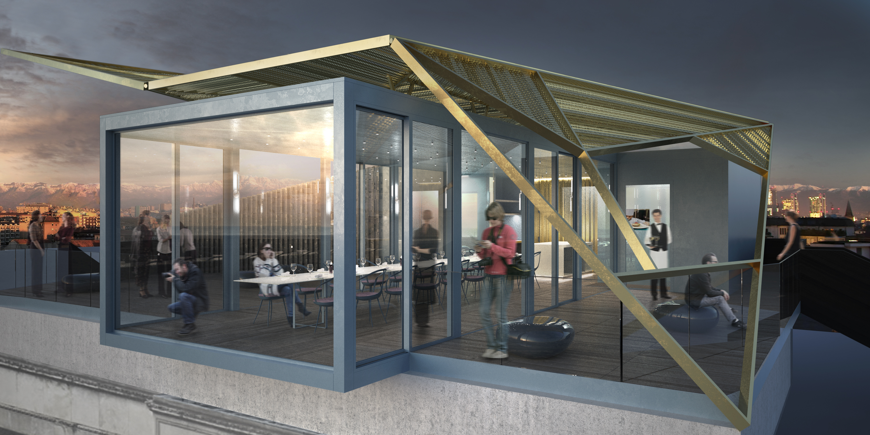 L’architettura, progettata dallo studio Park Associati, contribuirà ad offrire un’esperienza d’eccezione, scenografica come quella di un teatro: pareti scorrevoli si muoveranno per isolare la zona cucina dalla zona pranzo, dal soffitto scenderà il tavolo già apparecchiato sorprendendo gli ospiti all’ ingresso, o al contrario il tavolo potrà alzarsi fino al soffitto per liberare spazio per momenti speciali. Anche il design è stato studiato all’insegna della sostenibilità, con ampie vetrate, una spettacolare terrazza panoramica e strutture in materiali riciclabili “made in Italy”. Il ristorante è una vera e propria installazione, capace di inserirsi nel contesto urbano in modo discreto e spettacolare al tempo stesso, con le sue forme leggere e trasparenti.