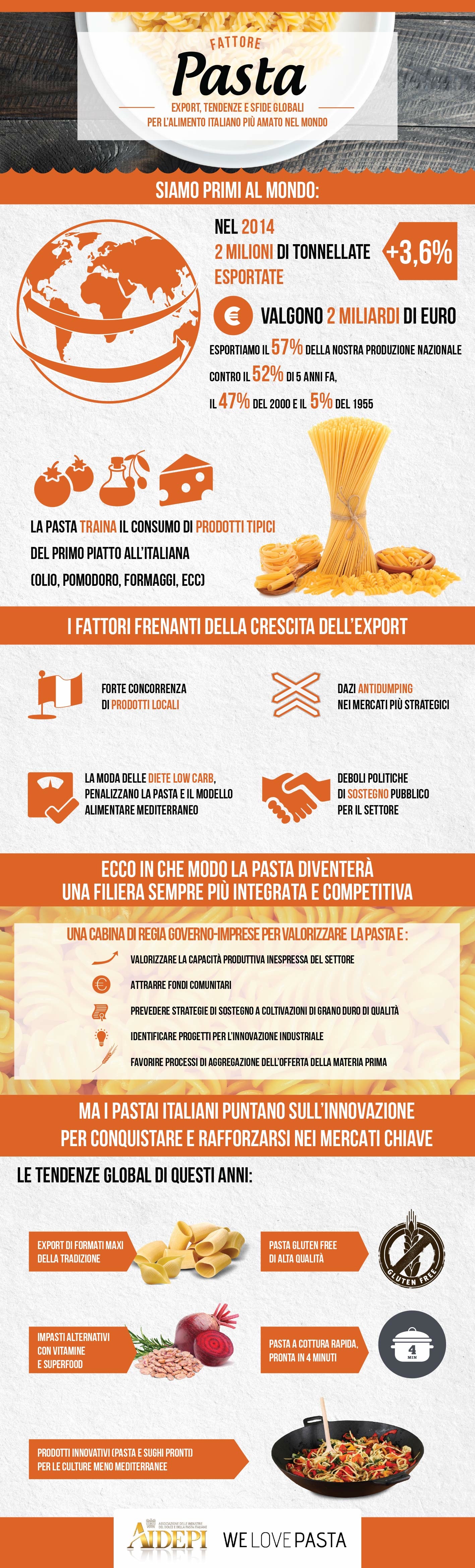 Pasta fa rima con Italia, si sa. E non solo all’interno dei confini nazionali, ma anche fuori. Siamo infatti il Paese con il maggior consumo procapite (circa 26 kg) ed esportiamo il 57% della nostra produzione nazionale (elaborazioni AIDEPI su dati ISTAT 2014). Pari a circa 2 milioni di tonnellate per un controvalore di 2 miliardi di euro, +3,6% - contro il 52% di 5 anni fa, il 47% del 2000... e il 5% del 1955. E quota 60% non è così lontana, anche se già ci sono pastai italiani che esportano oltre il 90% della produzione. Per intenderci meglio: oggi, ogni 10 piatti di pasta serviti nel pianeta, ben 3 parlano italiano.