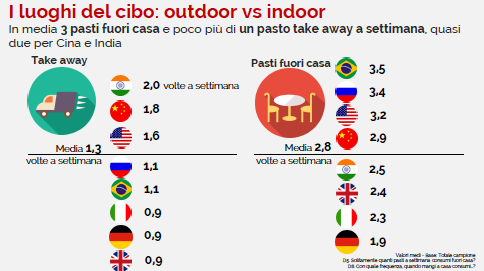 Oggi le differenze sono veramente tante e iniziano fin dalla preparazione del pasto, a cui ci si dedica in media 1,3 ore al giorno, ma con valori nettamente più alti per Paesi come il Brasile, l’India e la Russia. Anche gli italiani non sono da meno e si distaccano in questo dai vicini europei. Situazione simile anche per il take away e i consumi fuori casa che nel Bel paese sono decisamente inferiori ai livelli dei Paesi anglosassoni.