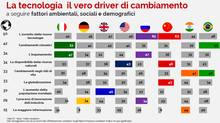 Tutti però (ed è veramente sorprendente come tale consapevolezza accomuni i cittadini di tutto il mondo) si mostrano consapevoli del cambiamento che ci aspetta quando si parla di cibo: solo il 2% afferma che non ci saranno cambiamenti in futuro, per il 46% invece sarà molto diverso, per il 18% radicalmente diverso e per la rimanente parte (un buon 34%) comunque cambierà anche se solo in parte.. Ma che cos'è che renderà diverso il cibo del futuro e quali sono i cambiamenti attesi? Metà del campione chiama in causa le nuove tecnologie il 42% indica nei mutamenti climatici la causa primaria del cambiamento e il 34% affina il tiro individuando come causa l'inquinamento e la disponibilità delle risorse naturali. Il 30% infine non dimentica l'aumento della popolazione e di conseguenza la minore disponibilità di cibo.