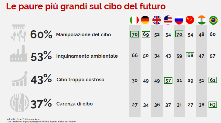Ad essere interessata da questi fattori saranno essenzialmente la naturalità del cibo (64%) la sua qualità e sicurezza (62%), la stessa tipologia di alimenti (60%). Proprio l'attesa di tali forti cambiamenti induce specifici timori sulla manipolazione degli alimenti che mangeremo (60%) e sugli effetti indotti dall'inquinamento ambientale (53%). In alcuni Paesi prevalgono al contrario i timori di un innalzamento del costo del cibo (Usa 57% Brasile 61%), un cibo meno democratico e solo per pochi, e del rischio di una futura scarsità alimentare (Brasile 63%). Il 72% del campione mostra infine piena consapevolezza sulla diffusione del cibo ogm.
