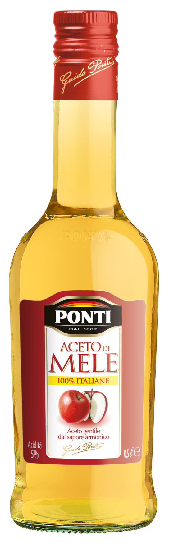 • Aceto di Mele Ponti: ricercato aceto prodotto da mele italiane intere maturate al sole. Grazie alla sua moderata acidità, al suo floreale bouquet e al suo gusto rotondo, l'Aceto di mele 100% italiane Ponti è un condimento indicato per insaporire piatti a base di carni bianche e salse delicate ed esalta gli aromi di insalate di verdure crude e cotte e macedonie di frutta (formato 500 ml).