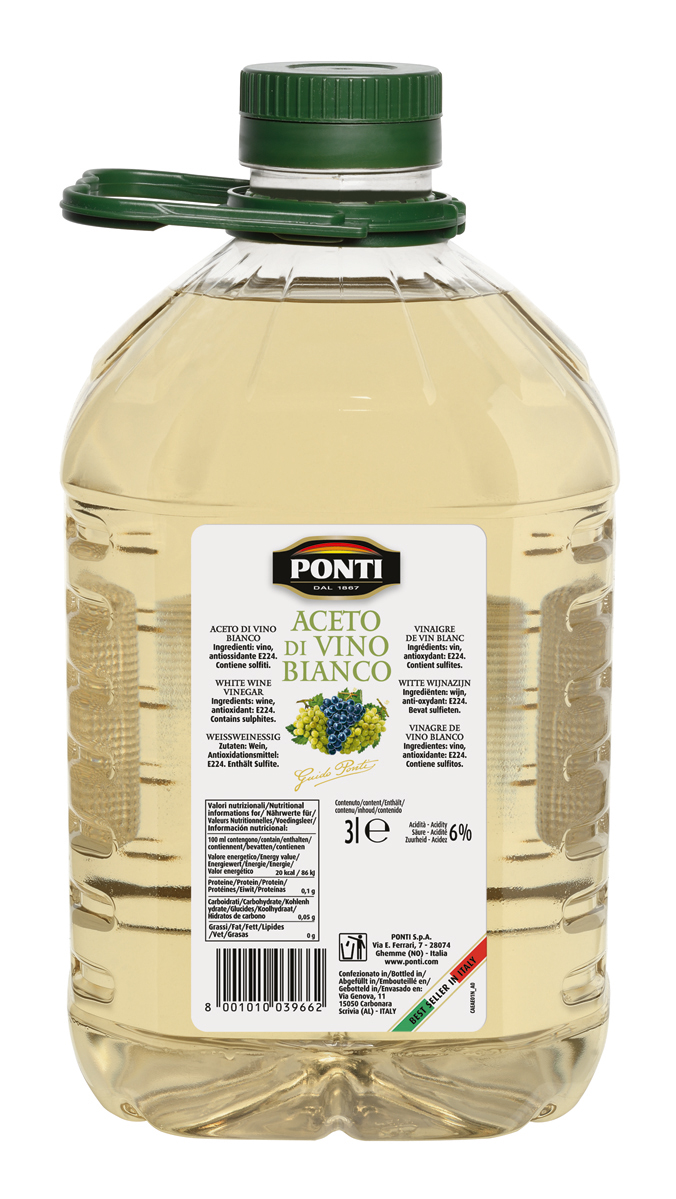 Ponti, storico marchio attivo dal 1867 nel segmento dell'aceto e delle conserve di verdura, offre ai professionisti della ristorazione un'ampia gamma di aceti per i più diversi utilizzi: dagli aceti classici di vino anche in grande formato per l'impiego in cucina, agli Aceti Balsamici di Modena I.G.P. straordinari in cucina e graditissimi a tavola, fino all'Aceto di Mele, per soddisfare anche le richieste più particolari dei clienti.3967_Acetovinobianco_3000ml