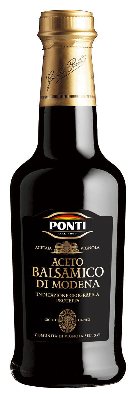 • Aceto Balsamico di Modena I.G.P. Ponti Capsula Oro Maturato 12 mesi: è ottenuto da una lenta acetificazione di mosto di uva cotto, proveniente da uve di vitigni selezionati, con pregiato aceto di vino. Matura in botti di rovere e si affina in barriques da 225 litri per un periodo di dodici mesi. Dal profumo intenso e fragrante, con un sapore dolce e agro ben equilibrato, è ottimo per insaporire carni 3881_Acetomele_500mlrosse crude e cotte, formaggi freschi e stagionati, verdure, fragole e gelato alla crema (formato 250 ml).3881_Acetomele_500ml