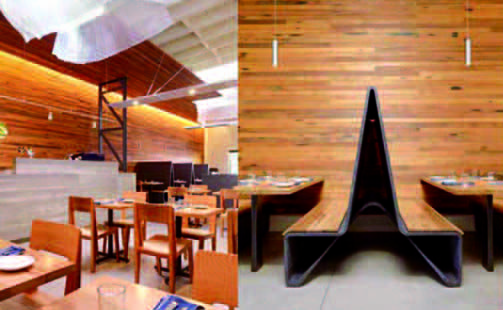 rendendolo naturale mentre l’acciaio e il cemento attestano il carattere urban. L’illuminazione primaria arriva da alcuni lucernari a soffitto da cui scendono delle sculture in vetro, la luce è distribuita in tutta la sala da pranzo, inoltre la sala gode di una ventilazione naturale e di conseguenza di un raffreddamento passivo. Questi elementi scultorei sono formati da cilindri in Pyrex deformati e fusi in volumi sinuosi che galleggiano delicatamente sopra la testa. Gli arredi sono pensati per poter essere riallocati all’interno dello spazio, pensati quindi per un layout fluido e dinamico. La struttura delle panche e parte dei banconi sono realizzati in calcestruzzo Ductal su stampo speciale (che rappresenta il materiale contemporaneo) con alte prestazioni tecniche, mentre il top del bancone è realizzato in assi recuperate da