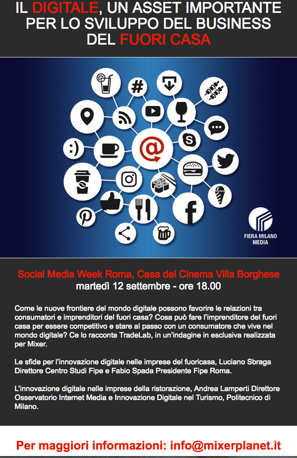 Di questo e molto altro si parlerà nel secondo convegno organizzato da Mixer durante la Social Media Week di Roma il prossimo 12 settembre. L’evento dal titolo “IL DIGITALE, UN ASSET IMPORTANTE PER LO SVILUPPO DEL BUSINESS DEL FUORI CASA” vuole proseguire le riflessioni iniziate l’anno passato durante l’evento per festeggiare i 30 anni di Mixer in cui avevamo iniziato ad analizzare le molteplici conseguenze della rivoluzione digitale sulle attività di bar e ristorazione, mettendo il mondo dell’ospitalità a confronto sulle diverse esigenze del “social consumatore”.