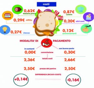 Si dirà “Ma i servizi aggiuntivi sono facoltativi e quindi l’esercente è libero di scegliere se accettarli o meno”. Parole corrette solo sul piano formale perché la realtà che conosciamo noi è completamente differente. I servizi aggiuntivi fanno parte di un unico pacchetto chiavi in mano la cui accettazione è la precondizione per ottenere il convenzionamento. Senza la loro sottoscrizione sfuma per l’esercente anche l’opportunità di poter contare sulle entrate generate da quella decina o centinaia di dipendenti che ogni giorno all’ora di pranzo gravitano intorno al suo locale. L’analisi della catena del valore del buono pasto offre spunti su cui riflettere. Abbiamo immaginato di consumare un panino e di confrontare il risultato economico nel caso di pagamento con buono pasto e di pagamento in contanti (v. grafico). Nel primo caso la perdita è di 0,16 euro, nel secondo il guadagno è di 0,14 euro. In definitiva tra l’incasso da buono pasto e quello in contanti c’è uno scostamento del 12% (0,30 euro su un valore di 2,50 ). Per mantenere invariato il guadagno il prezzo del panino acquistato con il buono pasto deve essere di 2,80 euro e non di 2,50 euro. Ed abbiamo volutamente trascurato il costo dovuto al supplemento di lavoro che la gestione dei buoni pasto richiede ad ogni impresa.