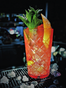 drink fruttati. Riscontra alto gradimento, per esempio, il mio Contadino Tropicale (4,5 cl di Domus Grappa di Ruchè, 2,5 cl di liquore all’arancio, 1 cl di sciroppo di passion fruit, 1/2 passion fruit fresco, 5 cl di succo di Guava, 3 lamponi freschi, 2 cl di succo di lime). Va preparato con la tecnica Swizzle pestando prima i lamponi in un tumbler alto e poi aggiungendo gli altri ingredienti e ghiaccio tritato. Come decorazione, suggerisco un ciuffo di menta fresca e una scorza di arancio.