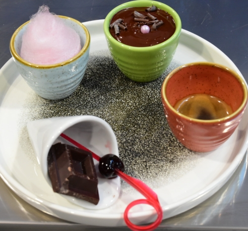 Il primo piatto del “maestro del caffè” è rivolto alla coppia mamma-figlia ed è composto da quattro distinte creazioni: un bicchierino con una spuma calda al cioccolato fondente, con un cuore di spuma fredda all’amarena; un bicchierino espresso 100% Arabica; un bicchierino con un cubetto di cioccolato fondente abbinato a un’Amarena Fabbri; un ultimo bicchierino composto da una piccola nuvola di zucchero filato alla fragola. Mentre la mamma sorseggia l’espresso, accompagnandolo con del cioccolato fondente, la figlia assapora le due spume con zucchero filato. Il secondo piatto è invece pensato per la coppia papà-figlio ed è composto da: un bicchierino con topping Fabbri allo zucchero filato; un latte scremato montato a freddo chiuso in superficie da pop corn glassati con il Chocokroccant Fabbri; un cono gelato di zucchero filato celeste; pop corn glassati con Chocokroccant posizionati dentro una piccola cloche. In questo caso il bambino può deliziarsi con i popcorn al cioccolato e lo zucchero filato, mentre il papà sorseggia il latte scremato. La permanenza al bar diventa così un occasione di piacere per la famiglia, capace di stupire gli occhi e il palato dei più piccoli.
