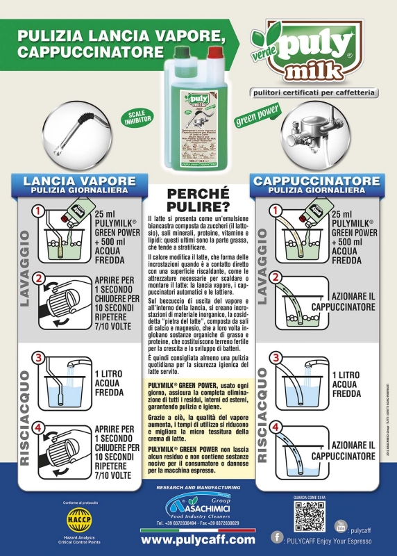 La risposta al “perché pulire?” con pulyMILK, il detergente per la lancia vapore e il cappuccinatore dice che “sul beccuccio di uscita del vapore e all’interno della lancia, si creano incrostazioni di materiale inorganico, la cosiddetta “pietra del latte”, composta da sali di calcio e magnesio, che a loro volta inglobano sostanze organiche di grasso e proteine, che costituiscono terreno fertile per la crescita e lo sviluppo dei batteri. È quindi consigliata almeno una pulizia quotidiana per la sicurezza igienica del latte servito”.