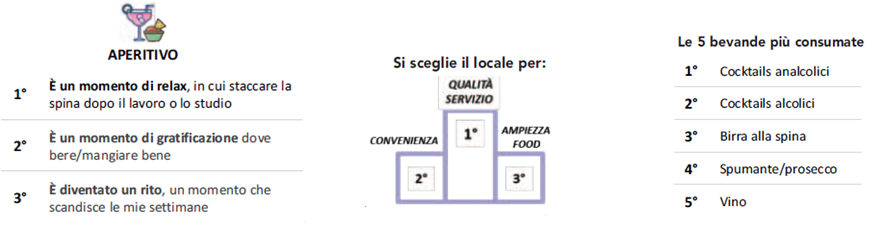 Quali sono gli aspetti principali che portano ad optare per un locale piuttosto che per un altro? “Qualità/servizio” occupa il posto più elevato sul podio, l’argento va alla “convenienza”; bronzo infine per “l’offerta food”. Quanto alle tipologie di prodotti più richieste, in assoluto i preferiti sono i cocktail analcolici, seguiti a ruota dai fratelli “più strong” (quelli alcolici), terzo posto per la birra alla spina; subito dopo spumante e prosecco. Naturalmente ogni età ha il suo drink preferito: se infatti i Baby Boomers prediligono il cocktail analcolico e il prosecco, la birra alla spina è più amata dai young Millennial (18- 24 anni). Una curiosità, infine, a livello geografico. Mentre i cocktail analcolici “spopolano” al Sud (a Palermo si registra ben il 47%) è invece il centro Italia, con Firenze, l’area “fedelissima” ai cocktail alcolici: 49%. Spumante e prosecco, infine, sono i più apprezzati nel bolognese.