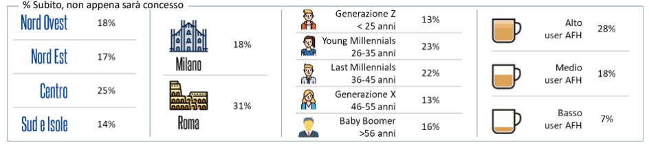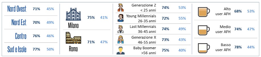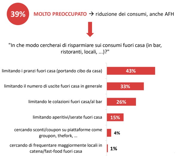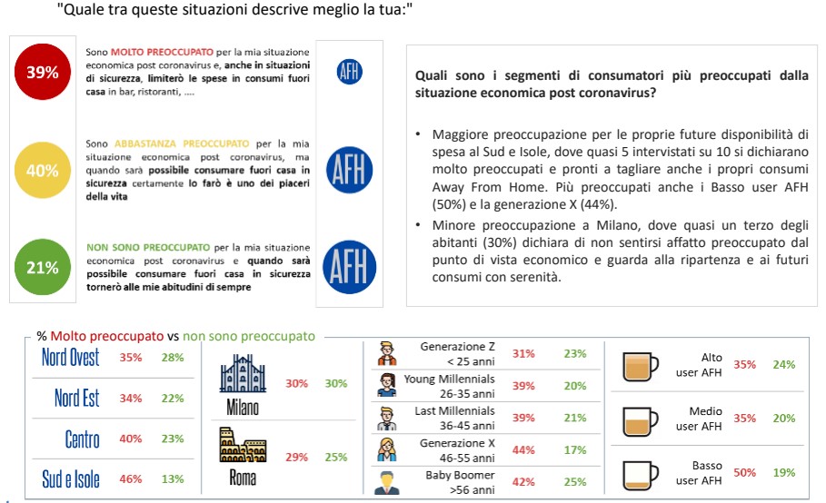 Milano si conferma la capitale del “bere”: il 23% dei residenti ha dichiarato di aver soprattutto voglia di bere un aperitivo contro il 14% dei romani; Roma la capitale del “caffè”: 3 romani su 10 sono in attesa di tornare a bere un caffè al bar contro 2 milanesi su 10. Per 6 italiani su 10 i consumi fuori casa sono irrinunciabili, nonostante anche tra questi la preoccupazione per la situazione economica personale sia presente (4 italiani su 10). Il 40% degli italiani, anche se abbastanza preoccupato per la prossima recessione, non intende rinunciare al piacere di consumare fuori casa e il 21% ritiene che la propria situazione economica non cambierà dopo l’emergenza sanitaria e continuerà con le abitudini Away From Home di sempre. Il 39% degli italiani si dichiara invece molto preoccupato rispetto alla situazione economica personale postcoronavirus e disposto/costretto a limitare i consumi fuori casa.