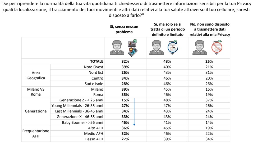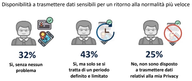 La voglia di normalità è però tanta, al punto di rinunciare alla propria privacy, almeno nella fase iniziale di “restart”. Secondo l’analisi svolta da TradeLab, oltre 7 italiani su 10 si dichiarano disposti a trasmettere dati sensibili per tornare più velocemente a condurre una vita normale. “Sì, nessun problema alla condivisione” per 3 italiani su 10, con picchi di consenso nelle fasce della popolazione più colpite dall’emergenza Covid-19: a Milano e fra la popolazione più anziana (over 56). “Sì, ma solo per un periodo definito” per 4 italiani su 10.