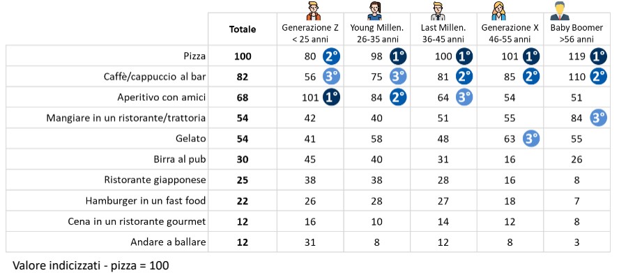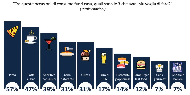 Preoccupazione per la salute ma anche tanta voglia di tornare a prendere un caffè al bar, mangiare una pizza o bere un aperitivo con gli amici. I baby boomer hanno voglia di tornare nei “loro bar” a bere un caffè (45%), la generazione Z sta aspettando di uscire a prendere un aperitivo con gli amici (27%), la voglia di pizza mette d’accordo tutti, giovani e meno giovani.