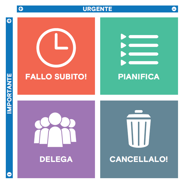 Dopo questa analisi, il passo successivo è utilizzare un importante strumento per la gestione del tempo, ossia la Matrice di Covey. Per Covey, saper gestire il tempo non significa fare una lista delle attività da svolgere e spuntarle mano a mano che vengono completate, ma è saper pianificare e stabilire delle priorità, cercando di escludere quelle di poco conto. Per questo motivo la matrice è composta da 4 quadranti dove inserire le attività eseguite durante la giornata in base a urgenza e importanza. Le cose sono urgenti o importanti, entrambe o nessuna delle due? Nessuna delle due, sono le attività da cui devi “stare lontano”, o che devi delegare, il quadrante urgente e importante comprenderà le attività su cui dovrai subito concentrarti.