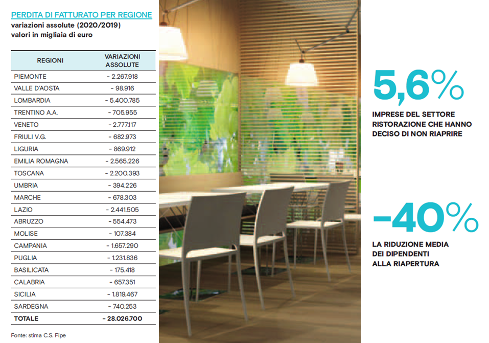 L’impatto della pandemia e delle necessarie misure restrittive è stato devastante per l’intera categoria e continua ad esserlo anche nella cosiddetta “Fase due”. Secondo le stime del Centro Studi FIPE, la pandemia Covid-19 l’emergenza epidemiologica, ha prodotto per l’intero comparto dei Pubblici Esercizi perdite di fatturato pari a circa 28 miliardi di euro, sull’anno in corso, mettendo a rischio 50.000 imprese e 300.000 posti di lavoro. La ripartenza è stata molto complicata per il settore della ristorazione, la maggior parte degli imprenditori ha deciso di riaprire già a partire dal 18 maggio (circa il 48%) mentre circa il 35% lo ha fatto solo qualche giorno dopo. Una minima parte, il 10,8% ha scelto di riaprire il primo giugno, mentre ancora meno, il 5,6%, ha rinunciato del tutto a riaprire a causa delle condizioni imposte ritenute economicamente svantaggiose. Per circa l’80% degli imprenditori intervistati lavorare con il distanziamento interpersonale e le altre misure anti covid-19 ha creato non poche difficoltà e la prima settimana di attività è risultata essere nel suo complesso negativa o molto negativa per ben il 74,5% delle imprese tanto da registrare cali di fatturato del 69,4%. La riapertura è avvenuta “con personale ridotto: il 40% dei dipendenti (pari a circa 400mila unità), infatti, è rimasto a casa”. A questo quadro si aggiunge che meno di un terzo dei lavoratori ha ricevuto i contributi previsti dal fondo di integrazione salariale e dalla cassa in deroga e dei 400 miliardi attesi sul Dl liquidità, ne sono stati erogati meno di 20. A conferma delle grandi difficoltà di uno dei comparti più colpiti dall’emergenza Covid-19 gli ultimi dati Istat sull’andamento del primo trimestre 2020 che ha visto una flessione del fatturato per le imprese della ristorazione rispetto allo stesso periodo dell’anno precedente del 23,8%. Sui primi tre mesi ha influito pesantemente il mese di marzo e preoccupa pensare a cosa succederà nel secondo trimestre con i periodi di chiusura più lunghi, tutto aprile e parte di maggio, e con la ripartenza lenta di giugno.