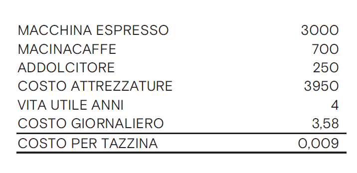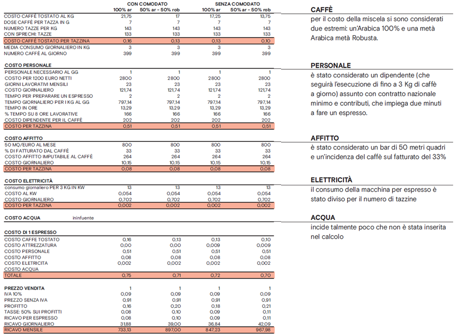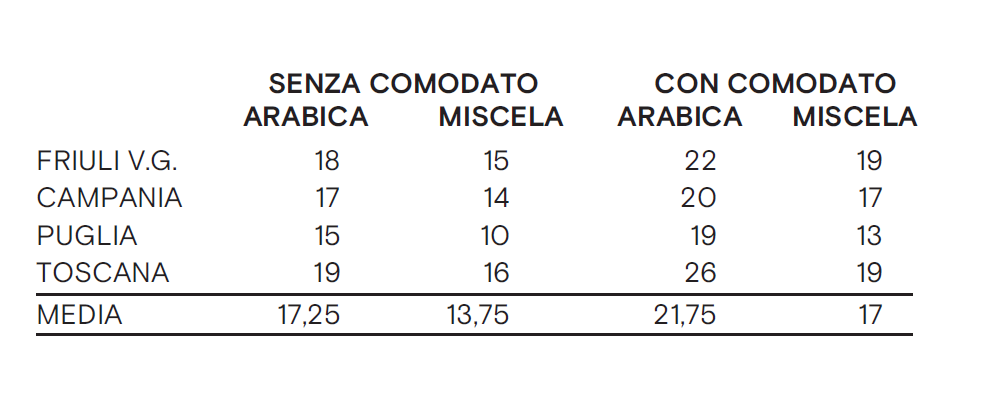 Si stima che circa l’80% delle attrezzature nei bar italiani sia in comodato d’uso, anche se non ci sono statistiche certe. La tabella mostra come il costo più alto della miscela in presenza di comodato (circa 3 centesimi a tazzina) non sembra giustificare la fornitura di una attrezzatura media (il cui costo può essere calcolato in meno di un centesimo a tazzina).