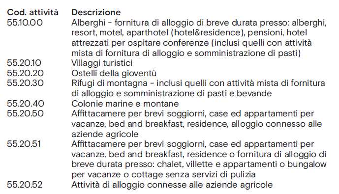 Gli operatori turistici che possono aderire all’iniziativa sono quelli che operano in settori specifici, contraddistinti dagli Ateco Istat indicati nel box seguente, incluse le strutture a carattere stagionale e in regola con i titoli prescritti dalla normativa nazionale e regionale per il turismo: