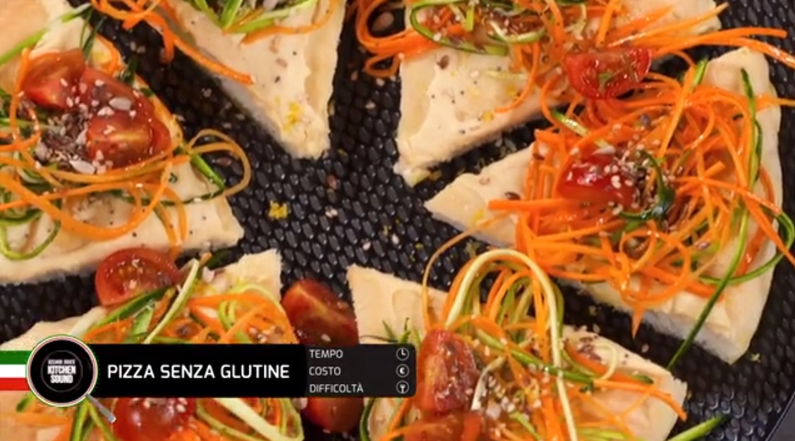 Spalmare sull’intera superficie della pizza la crema di ceci e porre sopra le verdure. Ultimare la farcitura con un filo d’olio evo e semi misti.