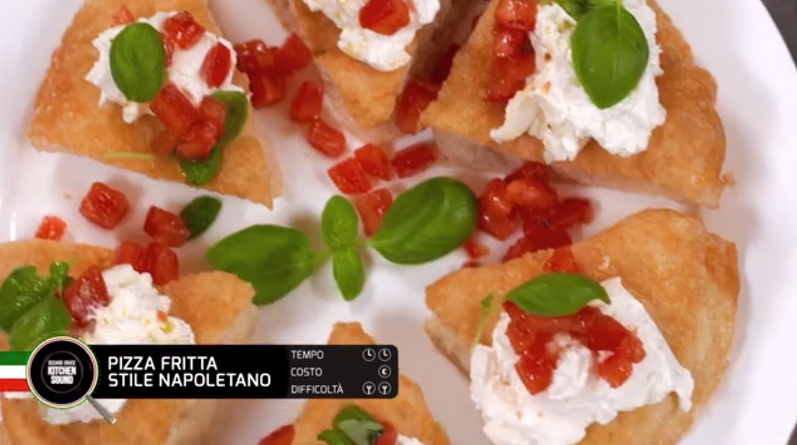 Far riposare l’impasto in massa per 20 minuti e poi dividere l’impasto in pezzi di circa 250 g cadauno. Formare le palline avendo cura di chiuderle bene sul fondo. Riporle in un cassetto di plastica per 8-10 ore a temperatura di 24°C e procedere poi con stesura, farcitura e cottura. Scaldare l’olio a 190°C, stendere e immergere la pizza all’interno e, quando arriva alla giusta doratura, con un utensile tipo ragno estrarre la pizza dalla pentola e porla su della carta assorbente da cucina.