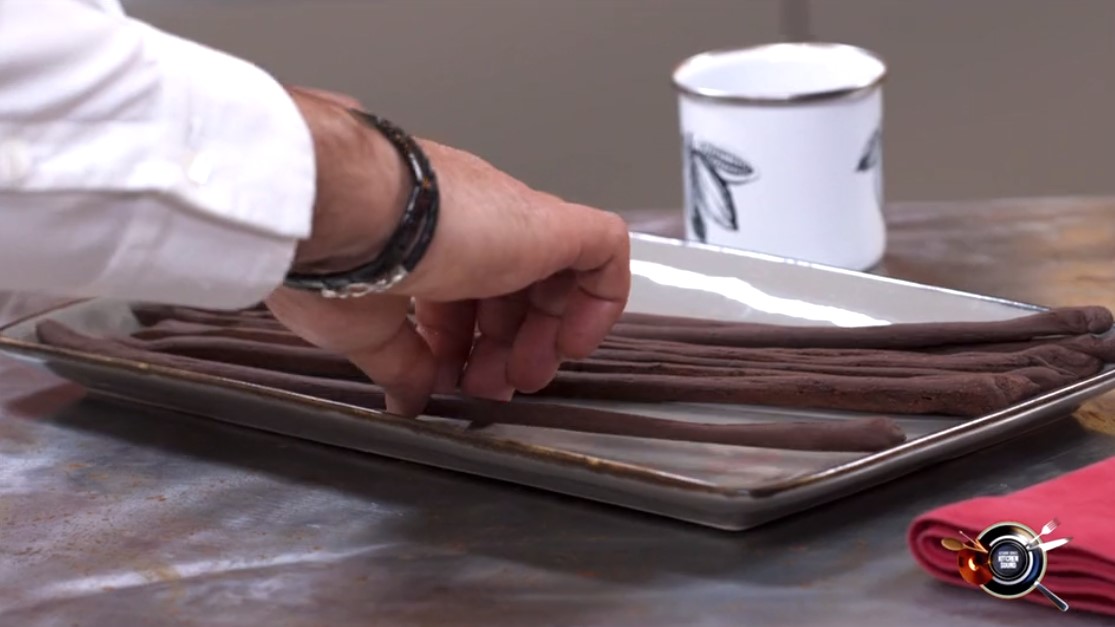 Per i grissini al cioccolato: in planetaria con lo scudo impastare farina, acqua e lievito a media velocità per circa 3/4 minuti. Aggiungere sale, cacao e olio. Far incordare l’impasto. Aggiungere il burro morbido poco alla volta. Far incorporare e, infine, aggiungere la granella di cioccolato. Far riposare l’impasto coperto, sul tavolo, per circa 30 minuti.