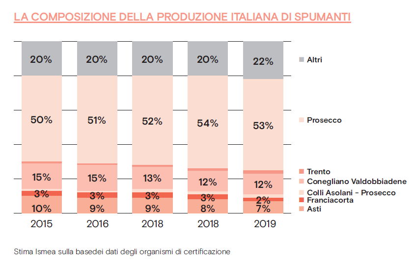 Una tipologia di successo che negli venti ultimi anni ha vissuto un successo costante, confermato da crescite anche a due cifre: quella degli spumanti italiani – metodo Martinotti e metodo classico – è una success story che sembrava non dovesse avere fine. E questo nelle sue varie declinazioni, presenti ormai praticamente in tutto lo Stivale, con 153 spumanti DOC, 18 spumanti DOCG e 17 spumanti IGT, cui si aggiungono 24 spumanti varietali autorizzati e diversi vini spumanti di qualità previsti dalla normativa. Anche la produzione nel 2019 è cresciuta, dell’8% sul 2018 (dati Ismea) raggiungendo i 5,7 milioni di ettolitri con oltre 760 milioni di bottiglie.