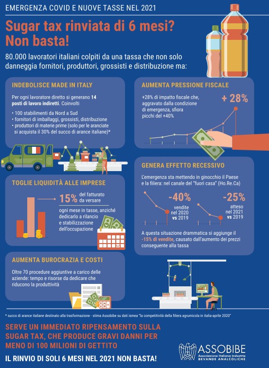 Assobibe, Confagricoltura e le sigle sindacali (Cisl-Fai, Cgil-Flai, Uil-Uila) hanno firmato un appello congiunto per chiedere al governo, a nome delle imprese e dei lavoratori che rappresentano, l’eliminazione o il rinvio al 2022 della sugar tax, una tassa che aumenterà la pressione fiscale del 28%, metterà a rischio 80mila posti di lavoro a fronte di un gettito fiscale di poco meno di 100 milioni di euro.