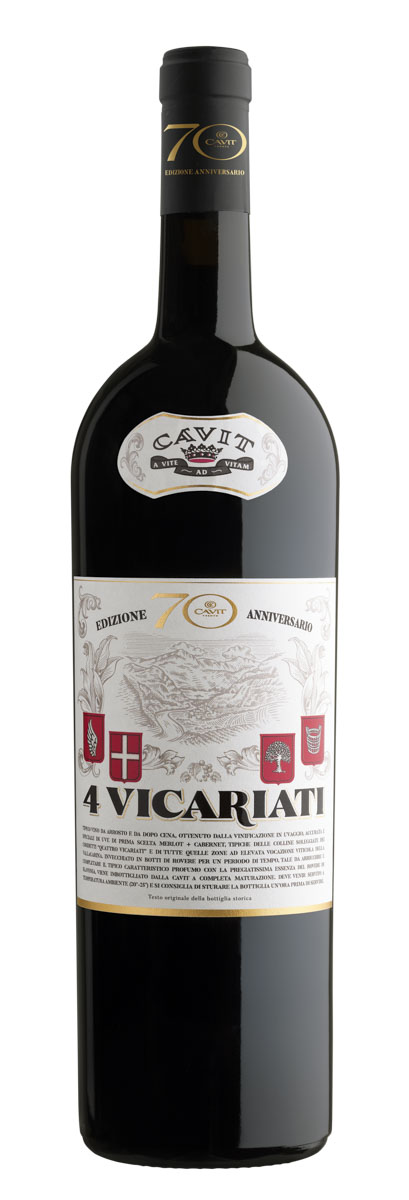 Il nome di questo “rosso bordolese” di particolare pregio deriva dalla zona omonima dei Quattro Vicariati, compresa fra i comuni di Ala, Avio, Brentonico e Mori in Vallagarina, particolarmente vocata per i grandi vini rossi. Un vino sapido e morbido che nasce dall’unione di Merlot, Cabernet Sauvignon integrati in piccola parte da Cabernet Franc, e che regala sensazioni balsamiche di prugna, mora e tabacco. Al gusto, evidenzia un grande equilibrio con note di peperone verde e piccoli frutti rossi maturi. L’Edizione Limitata è caratterizzata da un elegante mood vintage: rivisitazione dell’etichetta storica di cui riporta loghi e testi originali insieme ad una stilizzazione grafica della zona d’origine di questo vino. A completare l’effetto rétro, il ricercato astuccio in carta naturale, perfetto per racchiudere un regalo speciale, da collezione. Questa magnum fa parte della linea fine wine di Cavit ed è dedicata alle enoteche.