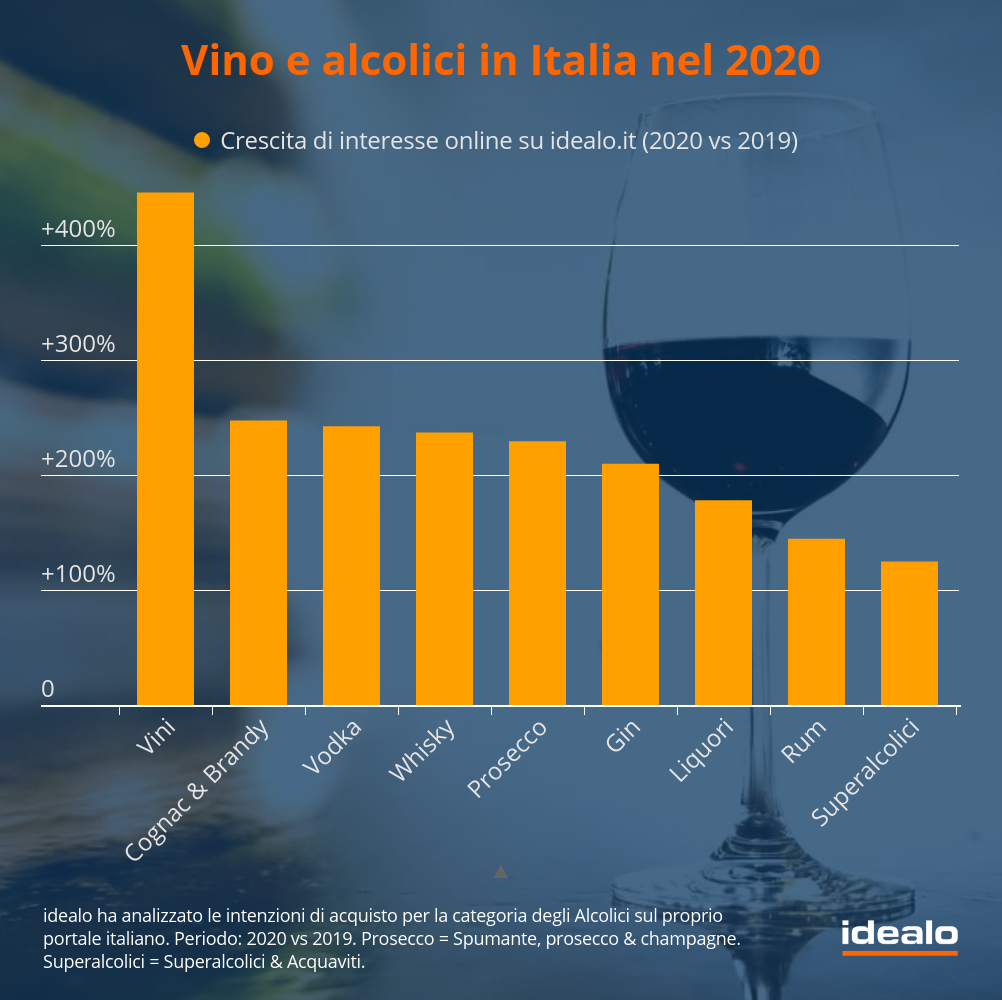 Ma quali alcolici hanno cercato di più online gli italiani nel 2020? Secondo i dati dell’ultima ricerca di Idealo, nell’ultimo anno si è assistito a un vero e proprio boom di interesse online da parte degli italiani nei confronti dei vini (+446,0%), seguiti da cognac e brandy (+247,6%), e poi dalla vodka (+242,7%).
