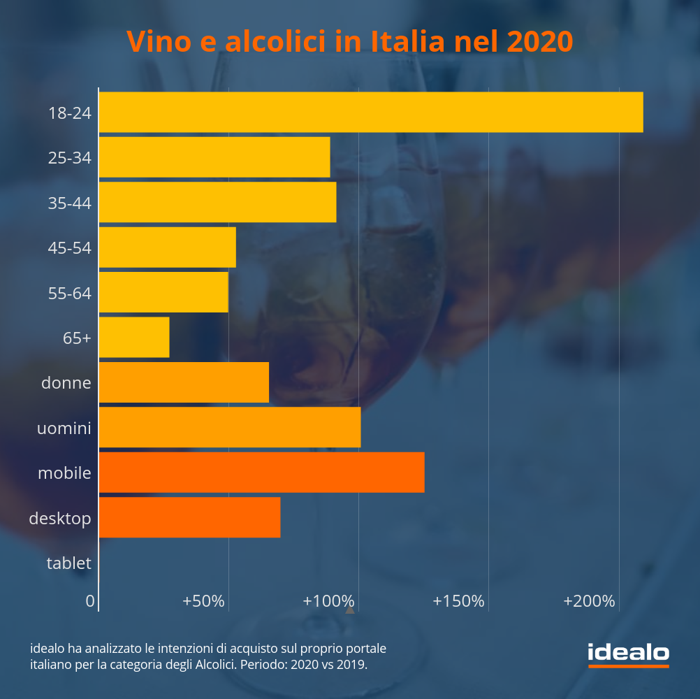 L’interesse online nei confronti degli alcolici è più che raddoppiato nello scorso anno in Italia (+110,2%) e a crescere maggiormente sono i giovani nella fascia di età tra i 18 e i 24 anni (+209,2%). E' quanto emerso dall’ultima ricerca di Idealo, portale internazionale leader in Europa nella comparazione prezzi.