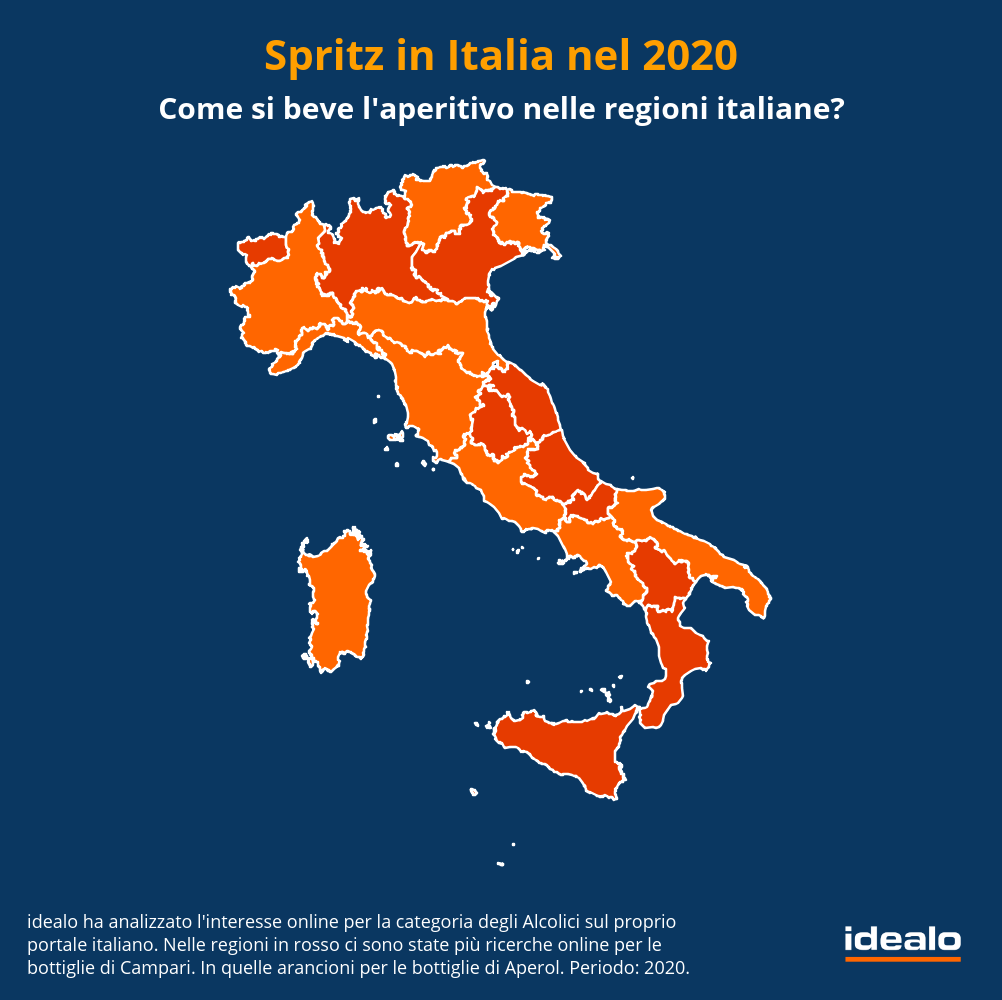 Gli italiani online nel corso degli ultimi dodici mesi hanno mostrato un interesse pressoché simile per entrambe le versioni con 10 regioni che hanno cercato di più l’Aperol e 9 che hanno cercato di più il Campari sul portale italiano di Idealo.